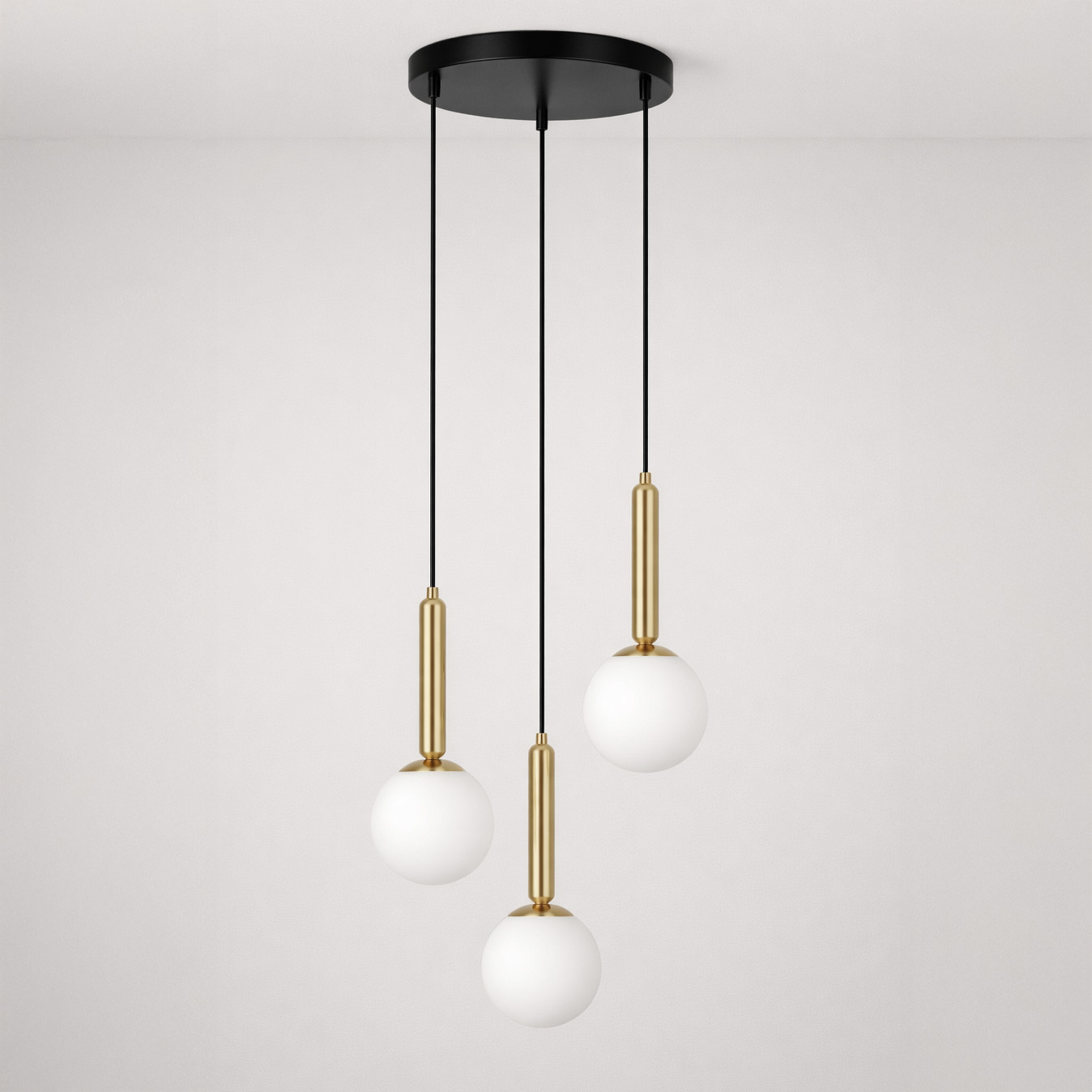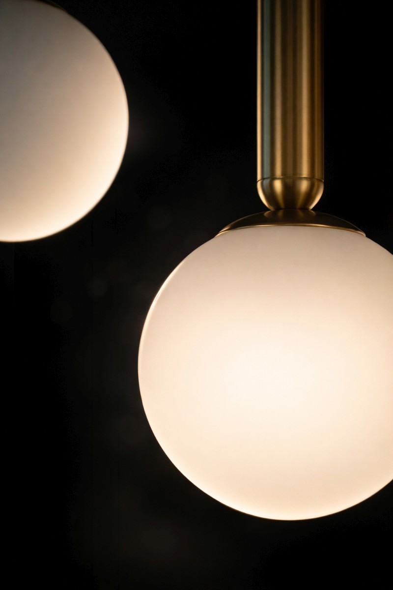 To, co wyróżnia lampa sufitowa z kulistymi kloszami TOKI, to umiejętność łączenia prostoty z charakterem. Białe, mleczne szkło daje miękkie, przyjemne światło, a czarno-złota armatura wprowadza elegancki akcent – bez przesady, bez efektu „przebrania”.