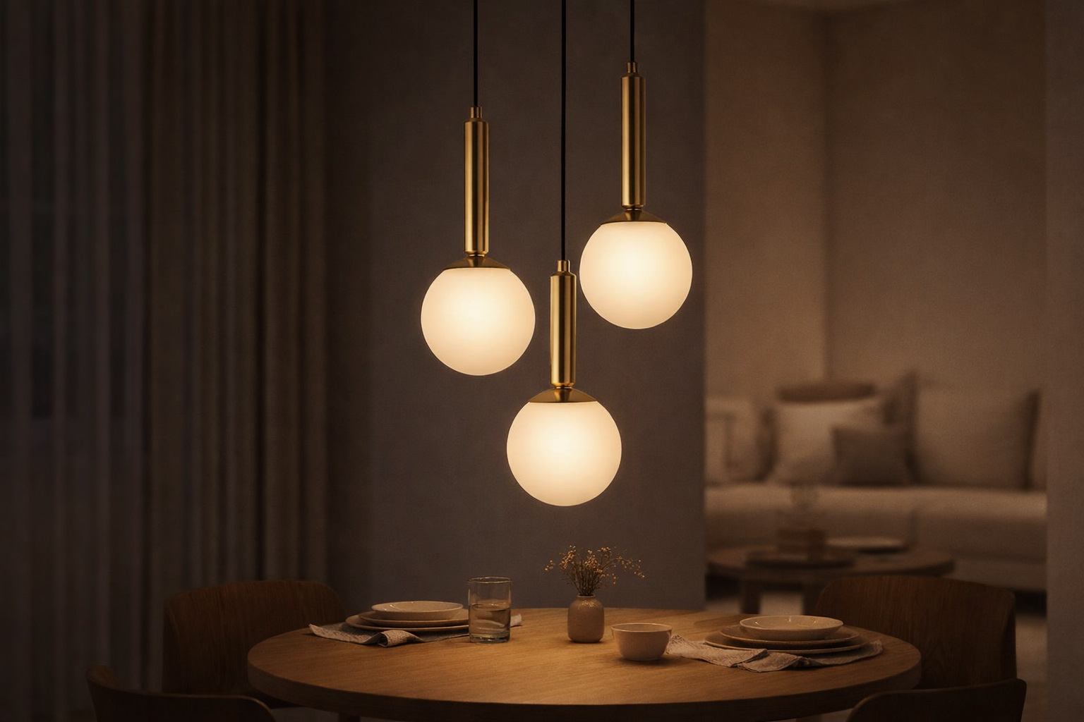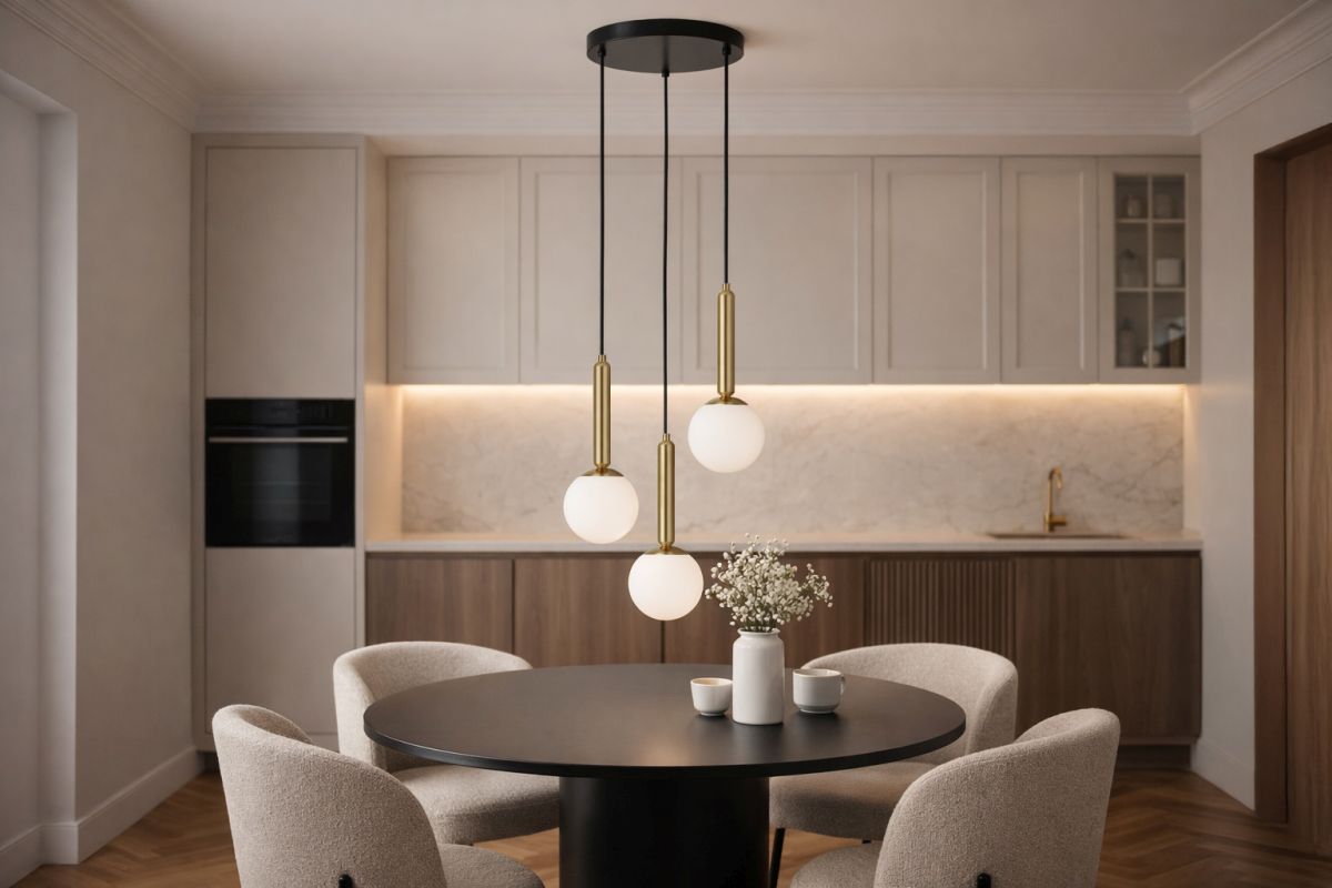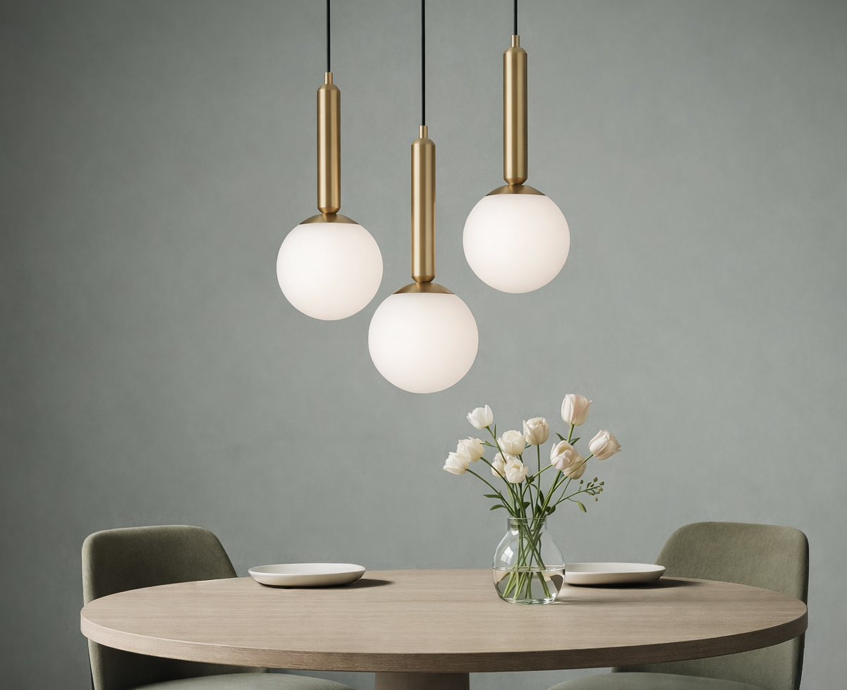 Trzy kuliste, białe klosze wypuszczone z okrągłej podsufitki tworzą kompozycję idealnie dopasowaną do centralnych układów – dokładnie tam, gdzie klasyczne lampy sufitowe do salonu często zawodzą. W praktyce? Wyobraź sobie wieczór przy okrągłym stole – światło rozchodzi się równomiernie, każdy ma komfort widzenia, a całość wygląda po prostu… dobrze. Bez cieni, bez chaosu, bez wrażenia niedoświetlenia. To właśnie robi dobrze zaprojektowana lampa wisząca do jadalni.